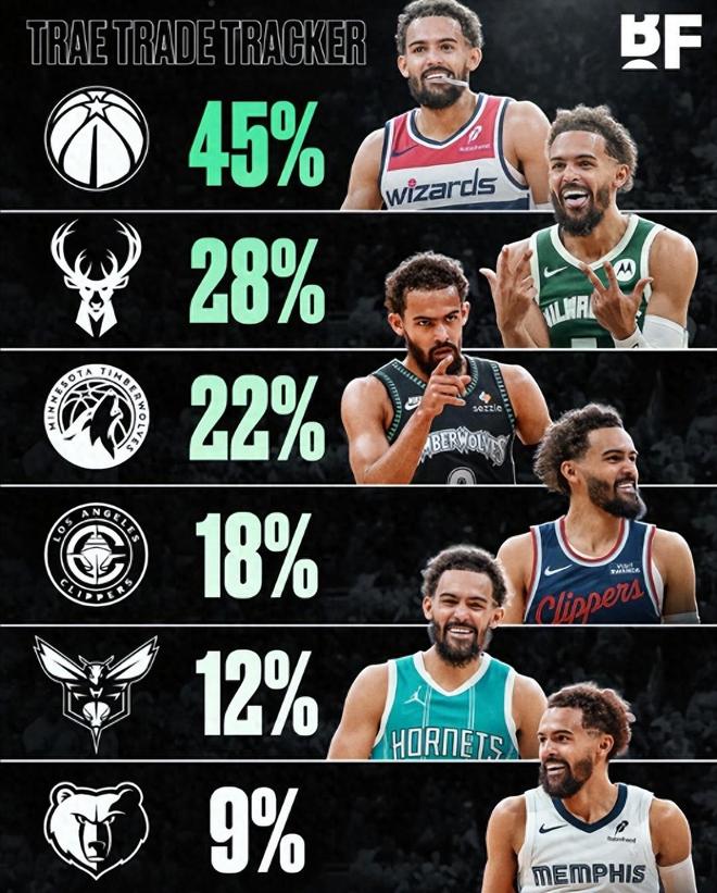 特雷杨潜在下家有6支,分别是奇才、雄鹿、森林狼、快船、黄蜂和灰熊。6支队伍中特雷杨加盟奇才的概率最高达到45%,排名第二的是雄鹿和森林狼。令人意外的是,6支球队中一支争冠队都没有,最好的森林狼也不过西部第6名,最差的奇才东区倒数第二。