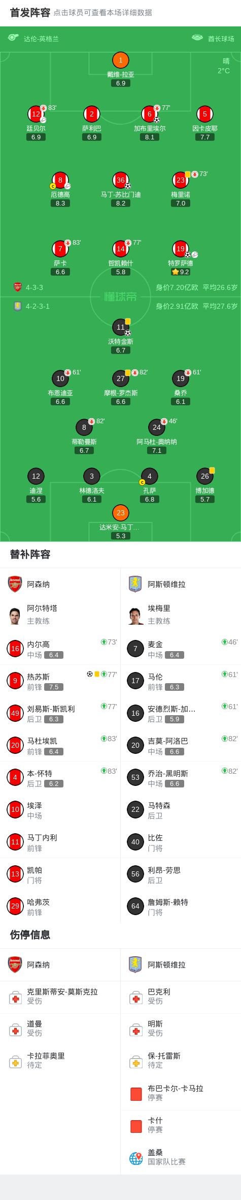 北京时间12月31日4:15,英超第19轮焦点战,阿森纳坐镇酋长球场迎战阿斯顿维拉,本场主裁判为达伦-英格兰。上半场,沃特金斯错失良机,哲凯赖什头槌造险。下半场,加布里埃尔、苏比门迪、特罗萨德、热苏斯先后建功,沃特金斯补时阶段扳回一城。最终,阿森纳主场4-1终结维拉各项赛事11连胜。